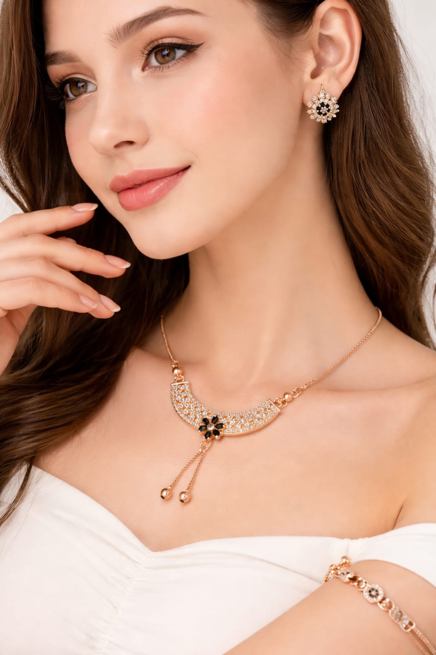 Description: The Obsidian Midnight Moon Collection is a masterwork of modern romanticism, featuring a coordinated ensemble that centers on a breathtaking crescent moon pendant. Crafted in a warm, polished rose gold tone, each piece is meticulously pavé-set with shimmering crystals that surround a singular, bold obsidian-hued floral motif. The centerpiece necklace is elegantly finished with a delicate drop-chain tassel, creating a graceful vertical line that adds a touch of movement to your look.