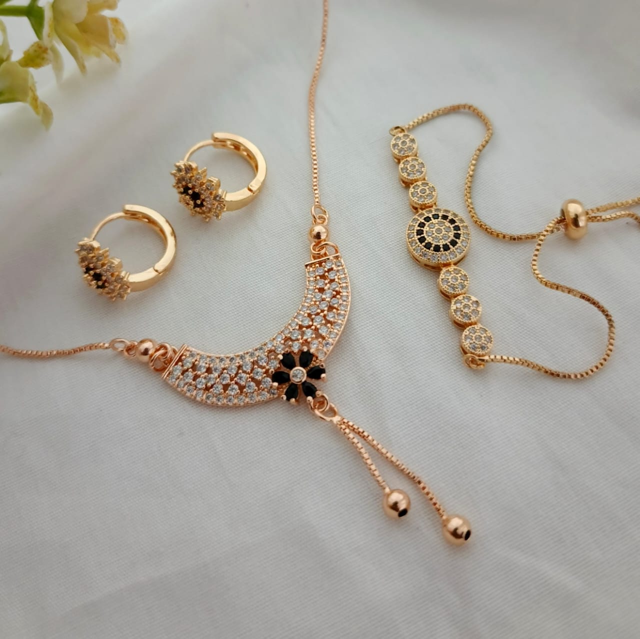 earrings, and a multi-element adjustable bracelet.