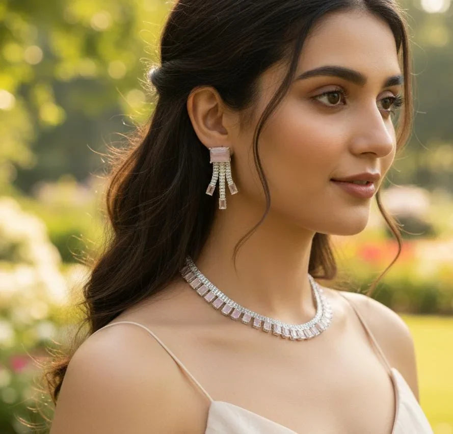 Embrace timeless beauty with our Pink Zarcoon Set, a stunning blend of elegance, charm, and sparkle. Designed with premium pink zarcoon stones, this three-piece artificial jewelry set radiates a soft, feminine glow that captures every heart.